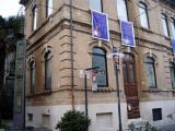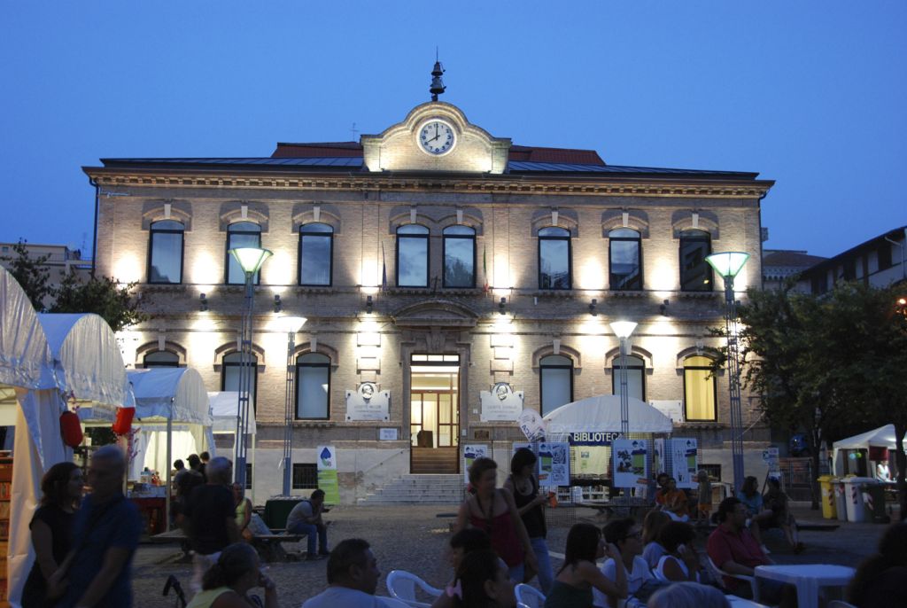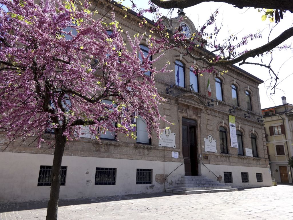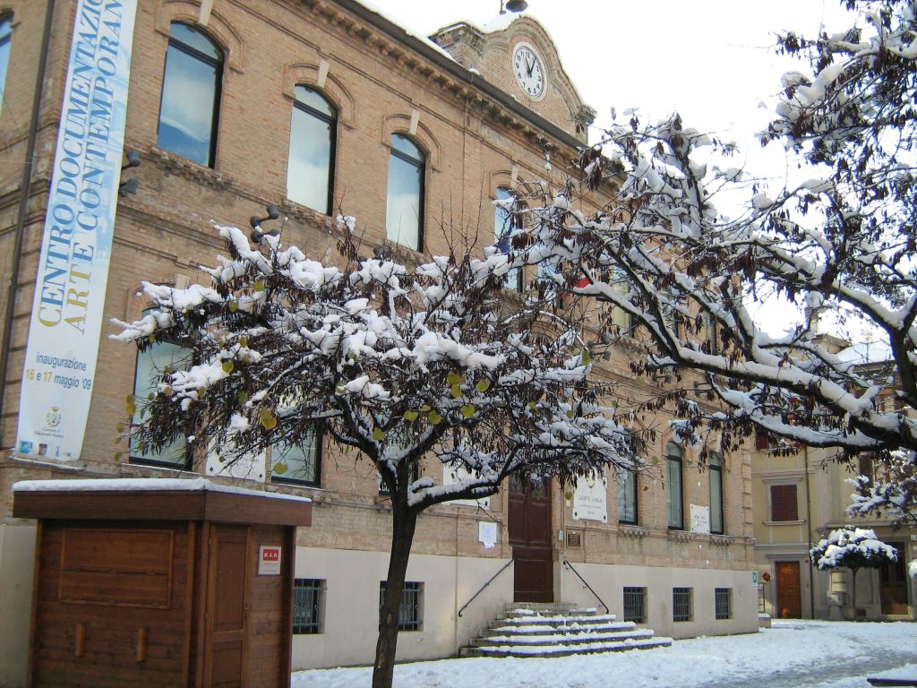 Il Centro Cultura "P. Pergoli" sede La Biblioteca di sera durante La facciata della Biblioteca innevata
